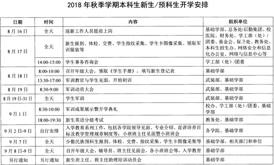 8月18日—9月1日新生军训,9月3日正式上课。上课课表和教材由辅导员老师负责通知,以班级为单位统一办理。