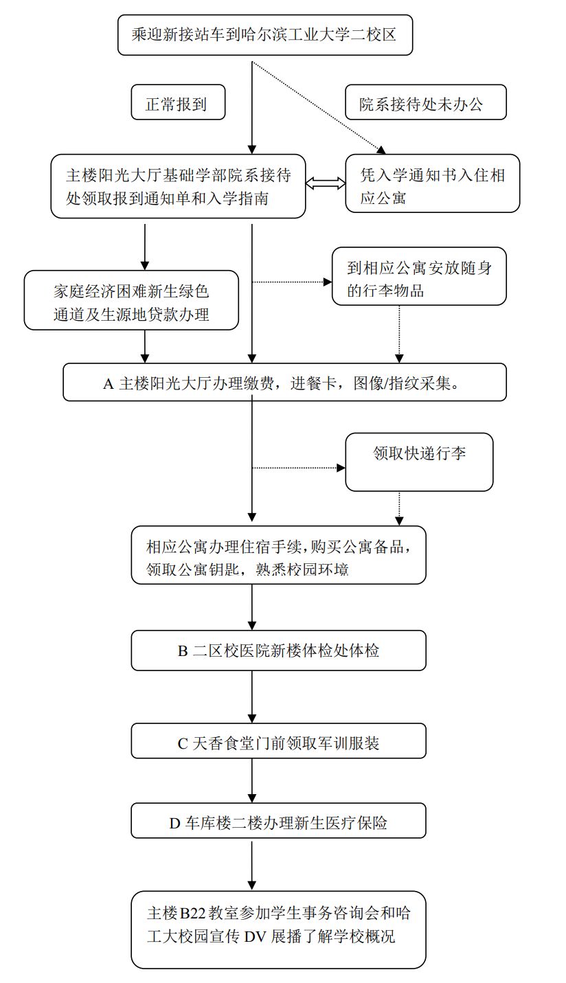 未办理生源地贷款的新生同学可持生源地乡、镇、街道民政部门盖章认定的《高等学校学生及家庭情况调查表》向辅导员老师提出申请(未成年人需持有监护人书面申请),在各院系报到处填写哈尔滨工业大学新生绿色通道入学签约书,然后到二校区主楼阳光大厅基础学部绿色通道负责人签字批准,并在同一位置的校学工部/团委“绿色通道”办理处办理相关手续。新生家庭经济困难学生还可以在迎新现场领取由哈工大基金会准备的涵盖各种生活用品的大礼包。