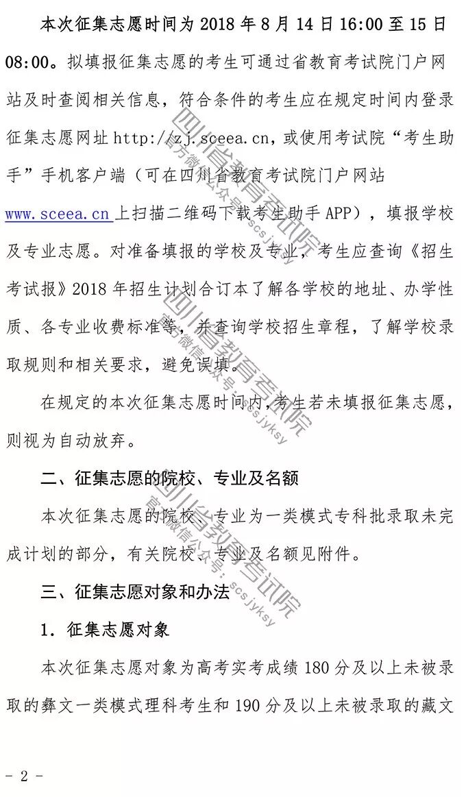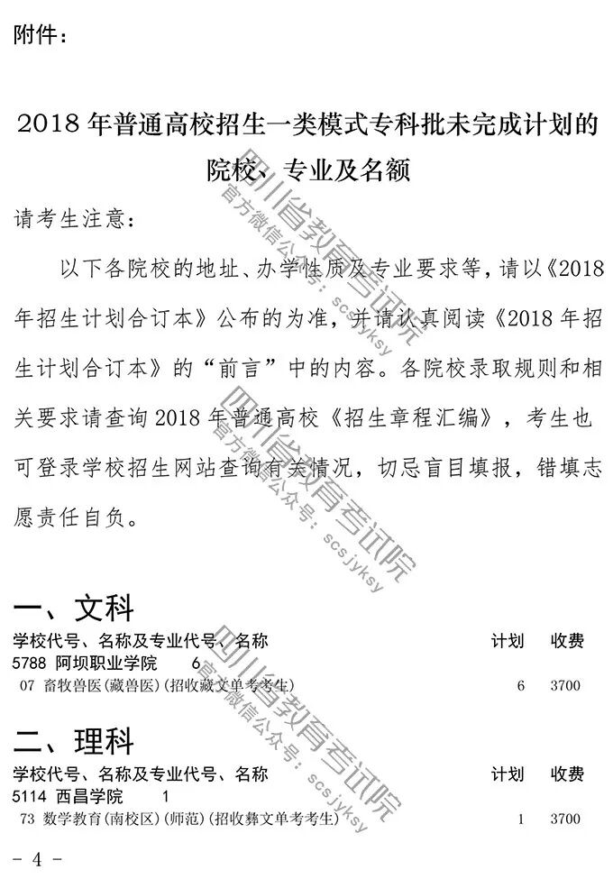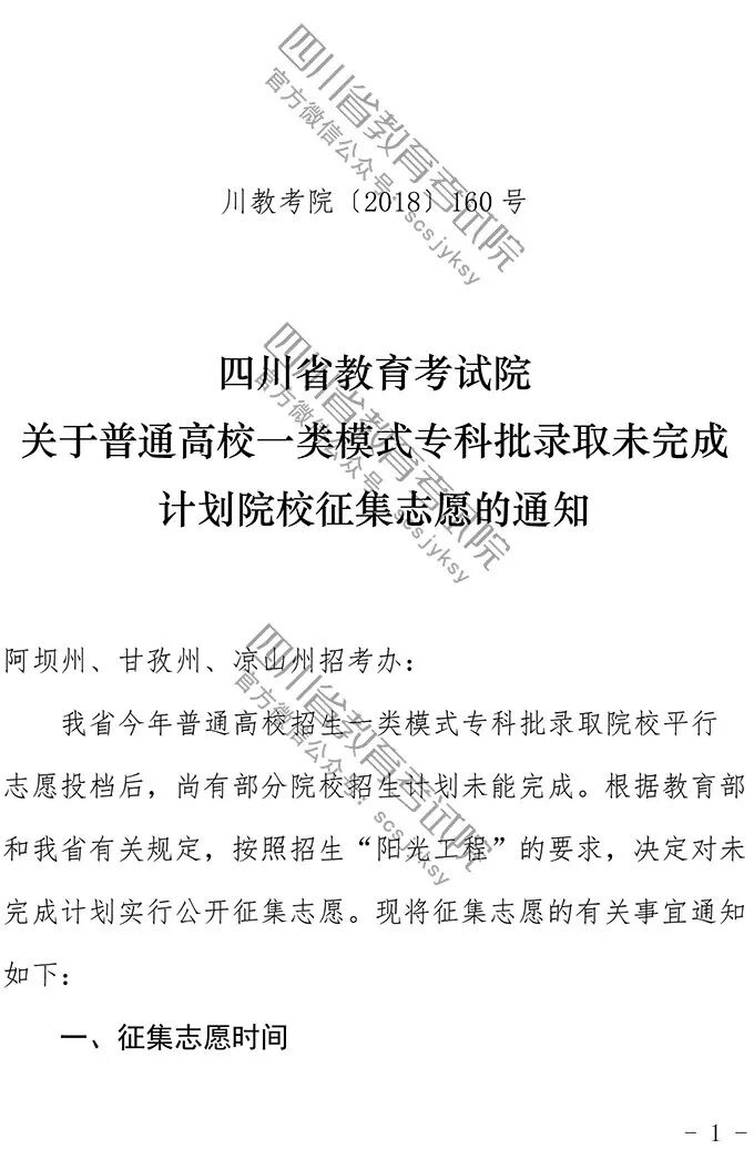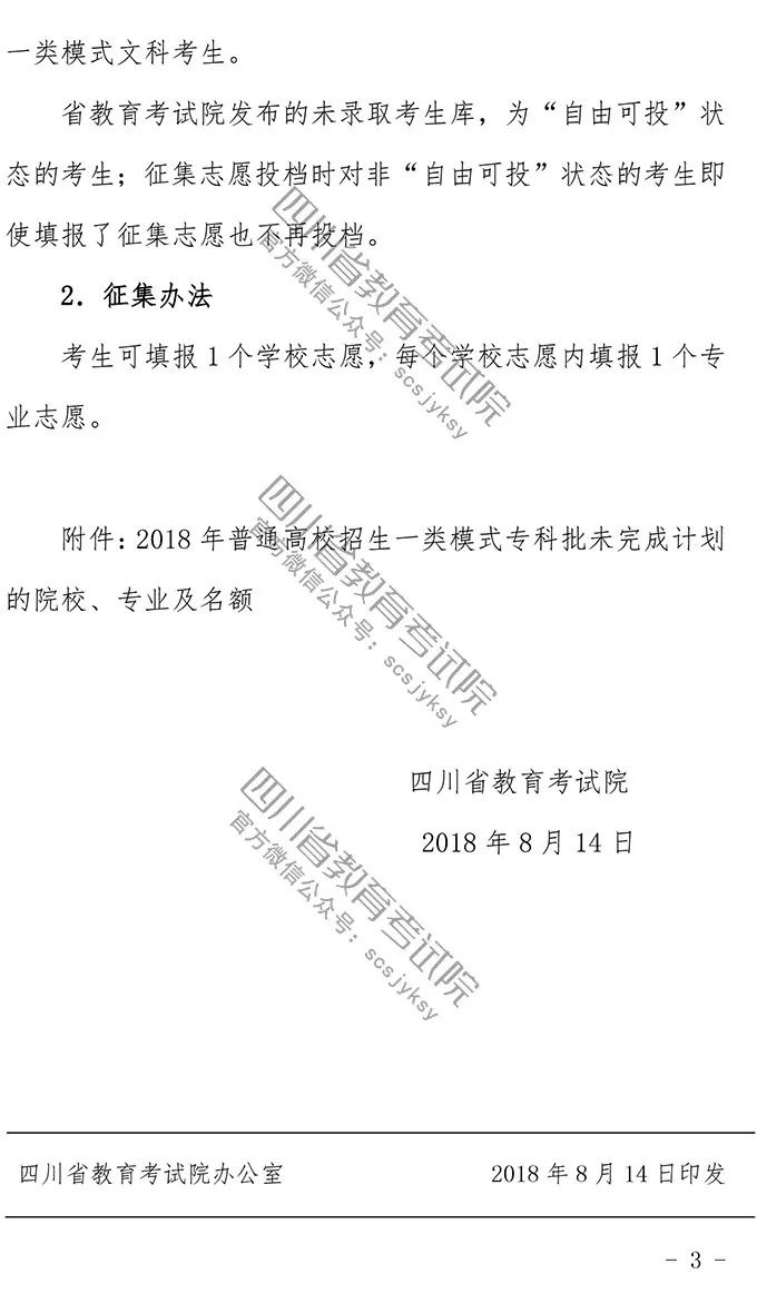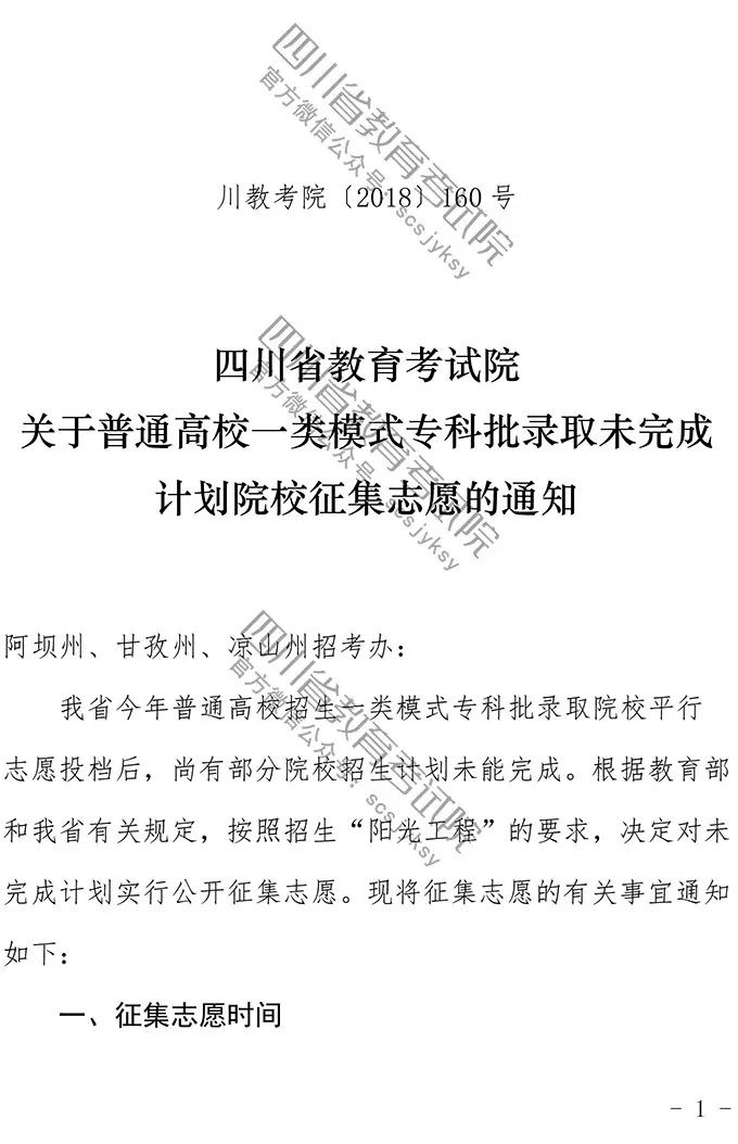 四川省2018关于普通高校一类模式专科批录取未完成计划院校征集志愿的通知