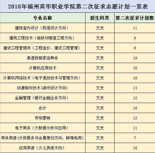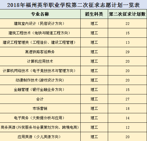 2018年福州英华职业学院第二次征求志愿招生计划院校代码:4035理工类