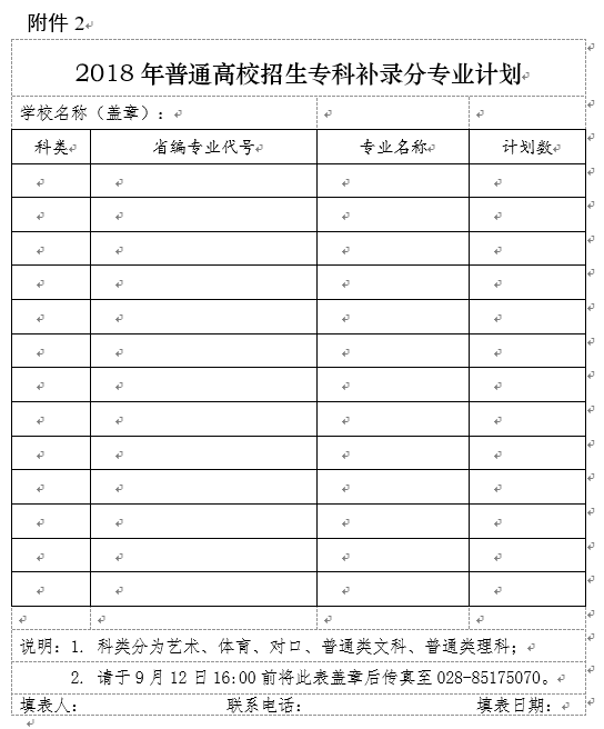 请各高校在我省8月18日录取工作结束后,及时下载录取新生数据库,同实际报到的新生名单进行核对。省属院校于9月8日12:00前使用普招录取系统用户名和密码登录http://wbd.sceea.cn网站报送未报到考生名单,同时将新生报到统计情况按《2018年四川省地方属高校普通专科补录计划申报表》(附件1)报省教育厅发展规划处(传真:028-86113561),发展规划处汇总各校缺额后,下达补录计划。各院校据此确定分科类、分专业人数,于9月12日16:00前将《2018年普通高校招生专科补录分专业计划》(附件2)加盖公章后报我院计划统计与考试评价处(联系电话:028-85174970、028-85178645,传真:028-85175070)。