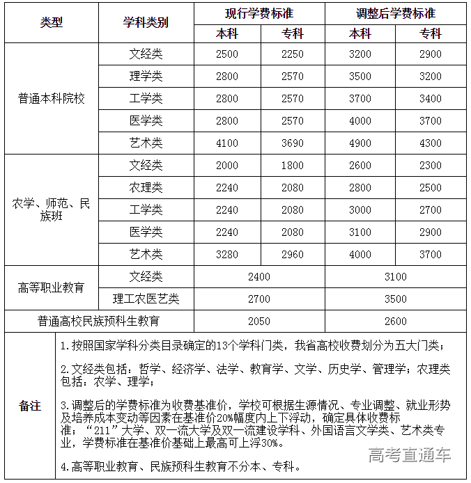(二)优化学费分类。根据国家学科分类目录,考虑不同学校、不同专业的教学质量、办学成本差异,重新划分普通本科学费分类,将原4类学费分类,即文史类、理工医类、外语专业、艺术专业,调整为文经类、理学类、工学类、医学类和艺术类5类;高职院校继续沿用原学费分类划分。