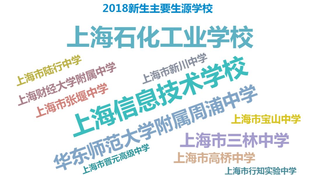 2018新生一共来自全国1765所中学。其中位列前五的分别是上海信息技术学校(中本贯通)、上海石化工业学校(中本贯通)、华东师范大学附属周浦中学、上海市三林中学和上海南汇中学。