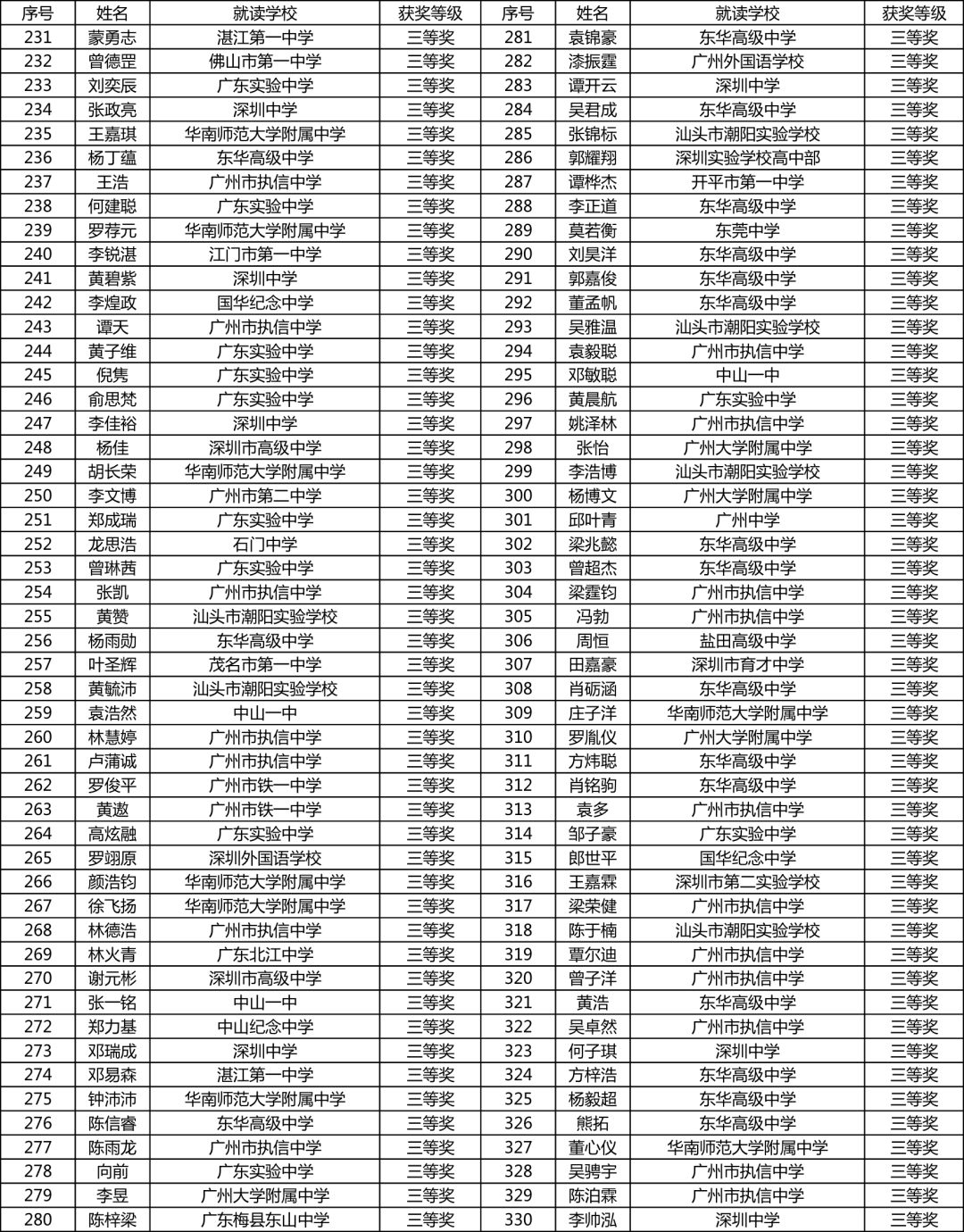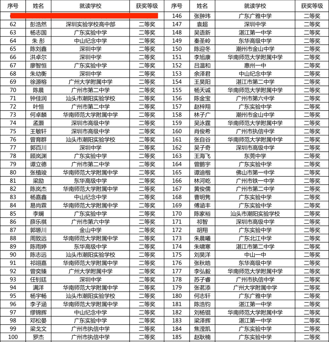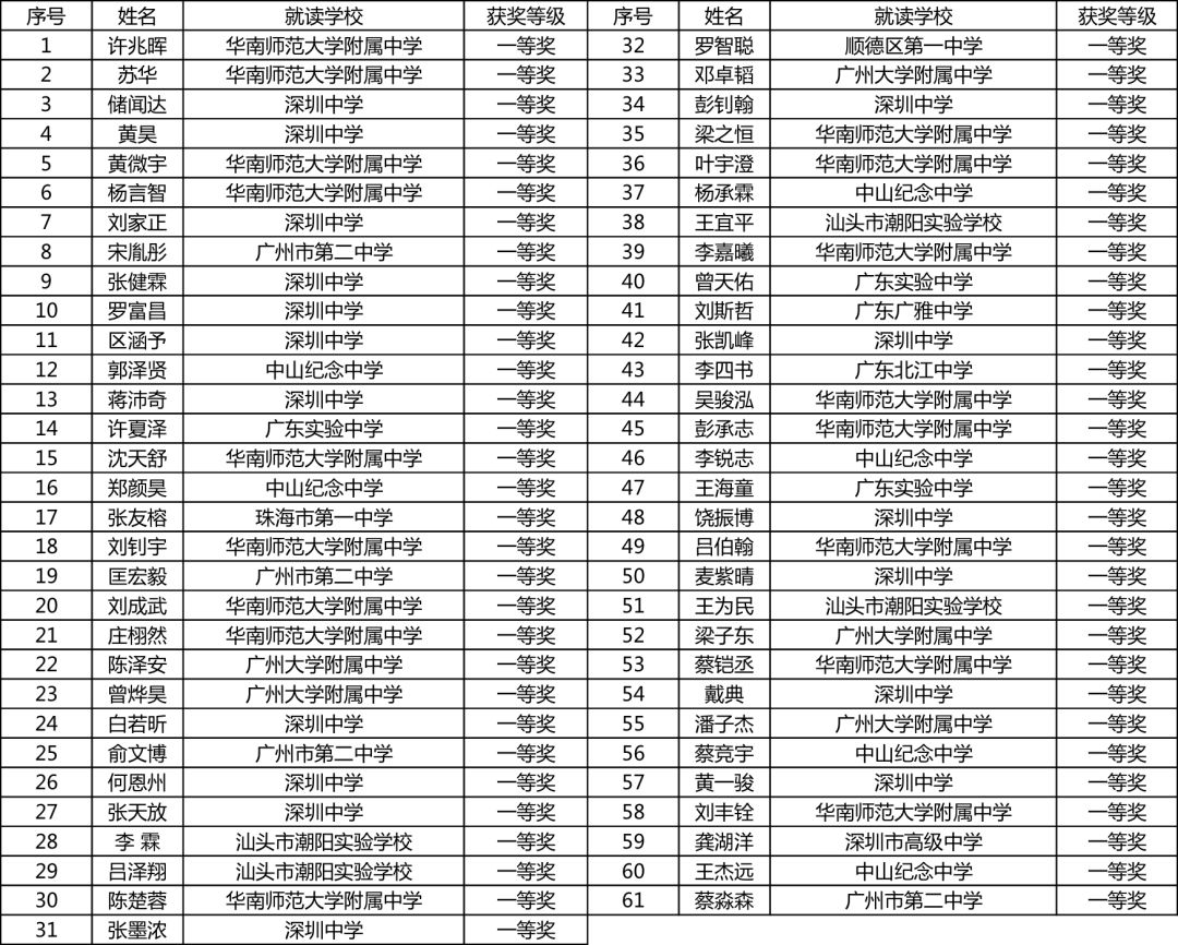 共61人获奖,其中获奖人数最多的前三名是华附、深中和中山纪念中学。其中华附和深中均以17人获奖并列第一,也与后面的中山纪中的6人拉开大比数差距。