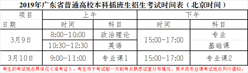 普通高校本科插班生招生考试时间为2019年3月9日(星期六)至10日(星期日)两天,具体安排在《准考证》上另行注明。