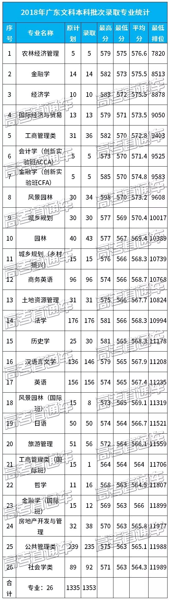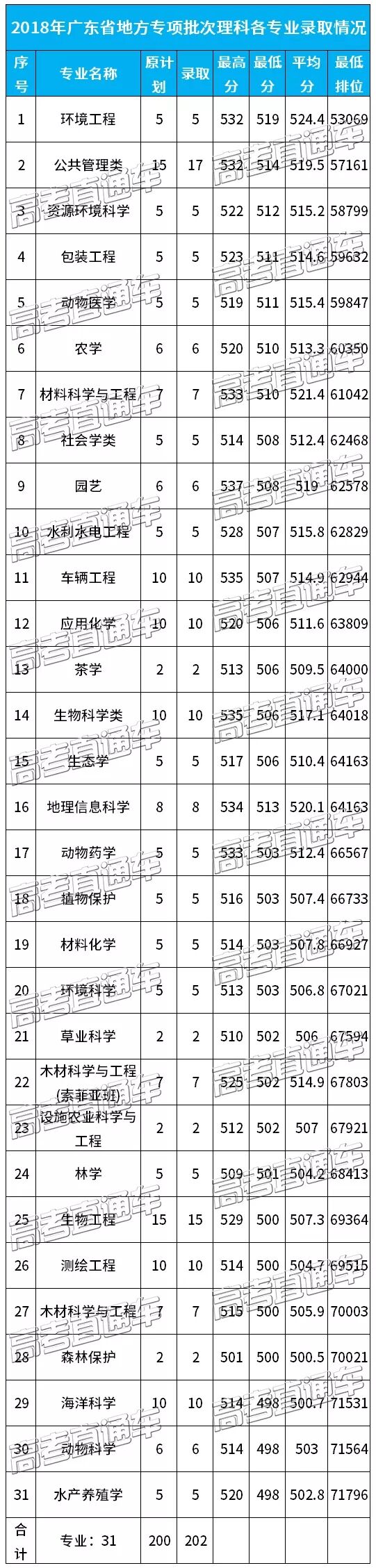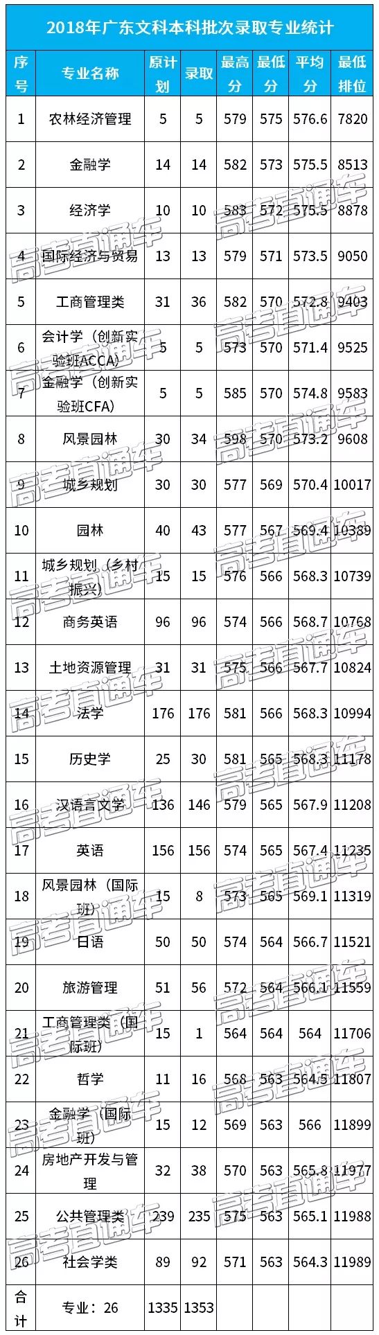 华南农业大学2018年各专业录取分数线