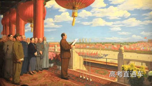 2、成立——⑴中央人民政府第一次全体会议召开(1949年10月1日)。内容:国家领导人宣布就职;会议决定任命周恩来为政务院总理兼外交部长,以“共同纲领”为施政方针。⑵开国大典:1949年10月1日下午举行,毛泽东在天安门城楼上庄严宣告:“中华人共和国中央人民政府今天成立了!”