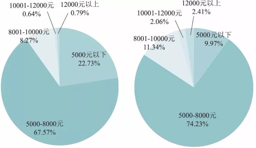 2018届毕业生在试用期后的月薪水平以5000-8000元为主,本科生和研究生的相应比例分别为67.57%和74.23%。