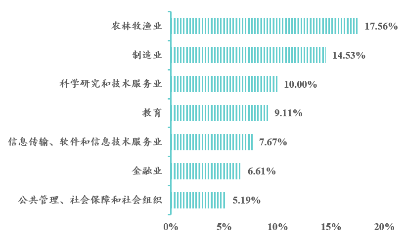 毕业生主要分布在农林牧渔业,制造业,科学研究和技术服务业,教育,信息传输、软件和信息技术服务业及金融业等行业就业,积极投身粮食生产领域等国家重要行业和领域。