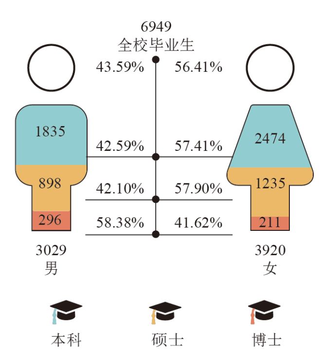 2018年,南京农业大学共有毕业生6949人,其中本科生4309人、研究生2640人(硕士生2133人,博士生507人)。全校男、女生比例为0.77:1。