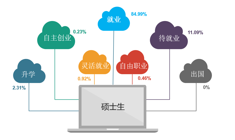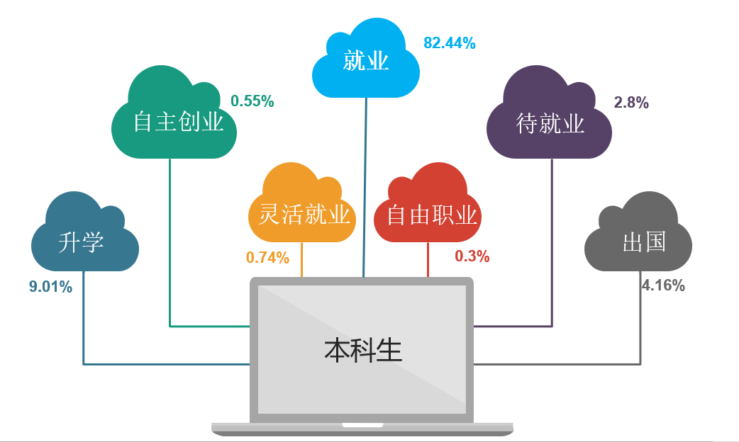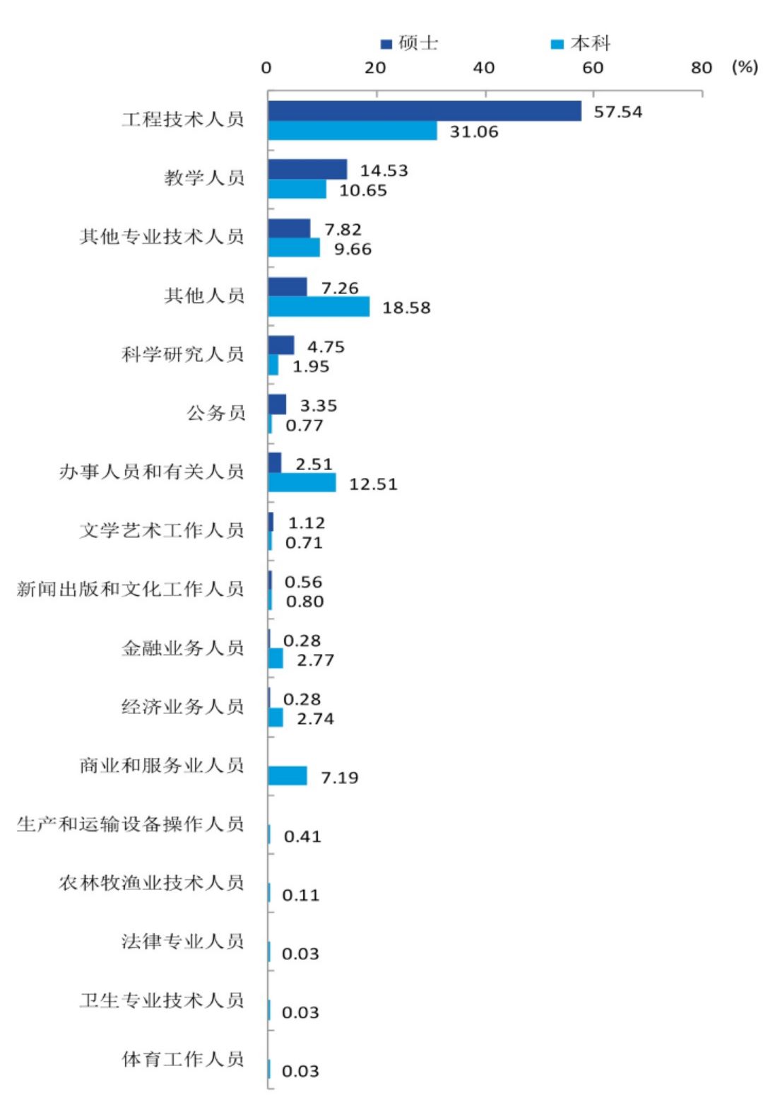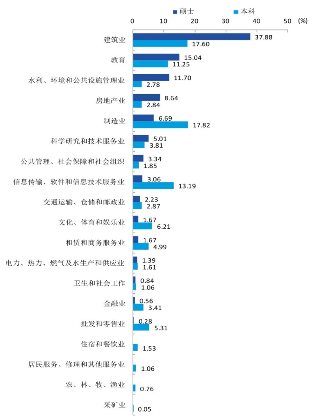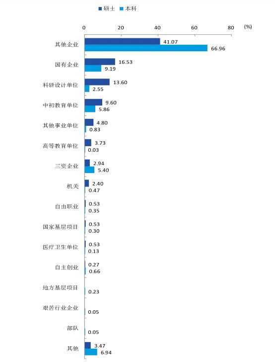 本校 2018 届毕业生就业以企业为主,其次硕士生在科研设计单位和中初教育单位就业较高,占比分别为 13.60%和 9.60%,本科生在中初教育单位和三资企业中就业较高,占比分别为 5.86%和 5.40%。