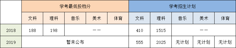 ★ 2018年学考录取最低投档分:文科188分、理科198分。