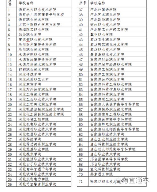 经河北省教育厅批准,2019年在河北省进行高职单招的省内院校有71所,名单如下: