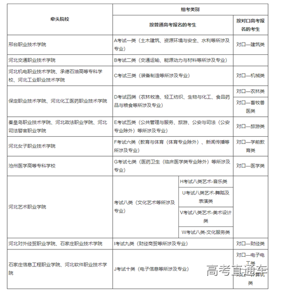 高考报名时考试类型选择“对口”的考生(以下简称“对口考生”),可不选择考试类,默认按考生高考报名时所选的专业类向相应牵头院校缴费并按要求参加考试(具体招生专业详询招生院校或以公布的招生计划为准);也可从统考计划10个考试类中另选一类,与该类的统考考生一起参加考试、录取。