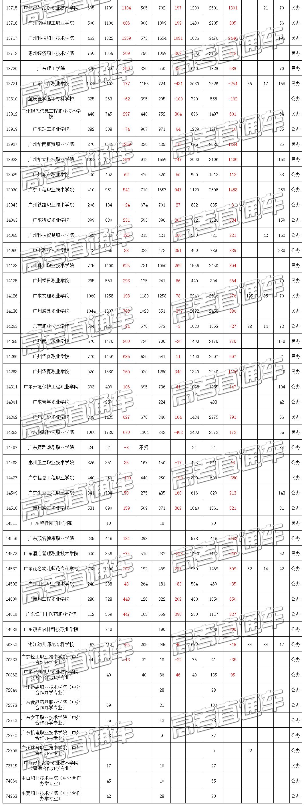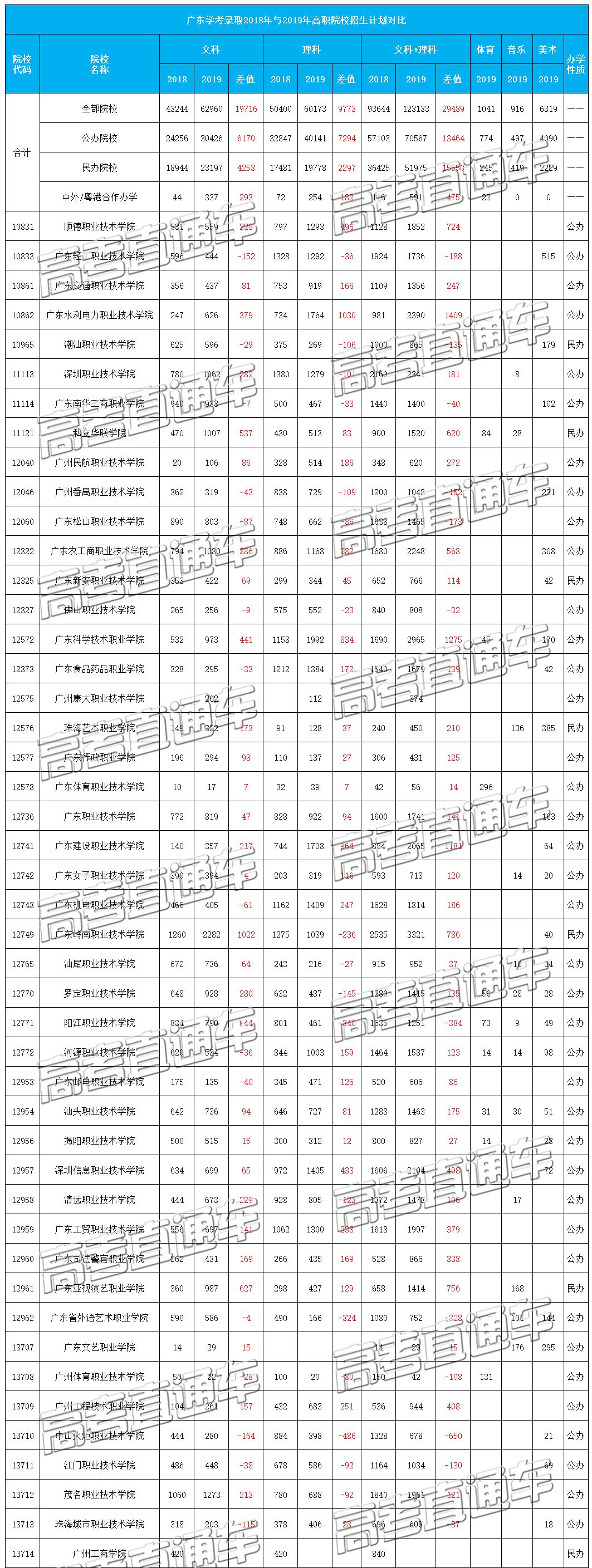 广东学考录取2018年与2019年招生计划对比 1.表格内“差值”(红色标注)一栏代表2019年招生计划减去2018年招生计划,数字为正意味着招生计划增加,数字为负意味着招生计划减少。 2.表格内部分院校2018年或者2019年没有数据,代表该院校没有参与2018年或者2019年的学考录取招生。 3.开展中外合作项目的院校在招生代码上会与原院校招生代码有差异,请注意辨别。