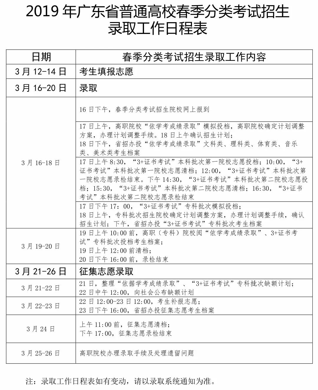 录取时间为3月15-26日。具体按《广东省2019年普通高校春季分类考试招生录取工作日程表》(见文后)执行。