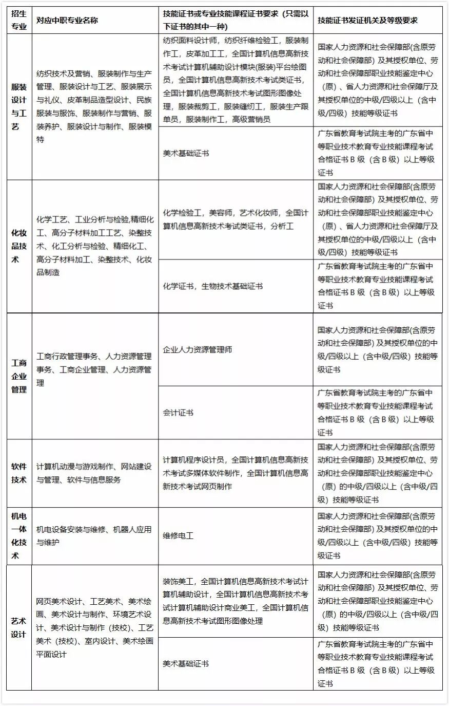 注:考生必须先确定中职所学专业与广东职业技术学院招生专业直接相关,再对应所取得技能证书或课程证书与招生专业所要求的相一致。技能证书上必须注明有中级/四级及以上等级字样,同时发证机关必须为省级以上人力资源和社会保障部门主考(或授权)的技能等级证书;专业技能课程证书必须注明有B级及以上等级。协会颁发的证书(如协会的单证员、跟单员)和上岗位证(如会计从业资格证等上岗证)不视为中级技能证书。
