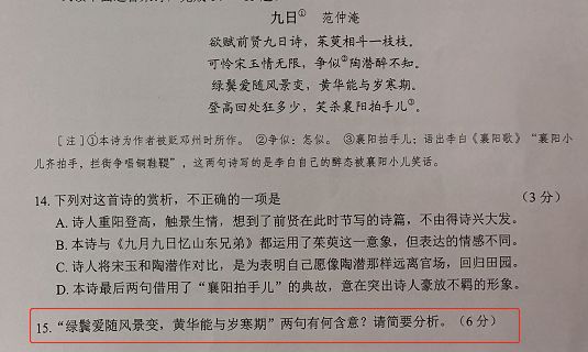 诗歌鉴赏,第15题,“颈联含义的理解”,含义题常规大类,答题由“翻译到情感”的逐步转换,比如“表层意+关键词分析+情感”三步走策略,结合上下文可知,作者要如岁寒三友一样,经冬不凋,勇往直前。