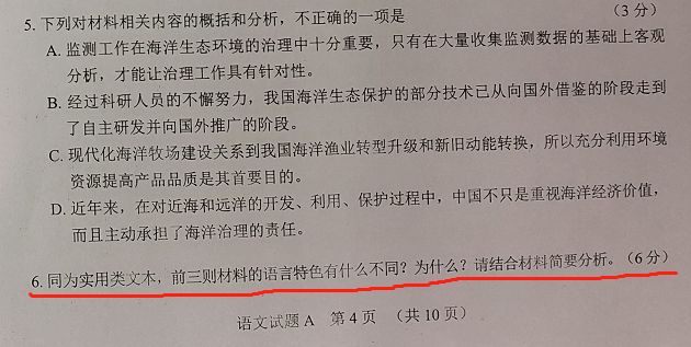 实用类文本,第6题,侧重对“分析语言特色”这一能力的考查,与去年高考“筛选并整合文中信息”有所不同,但设题方式清晰,明确指向“语言特色”。明确语言分析,设题明晰。
