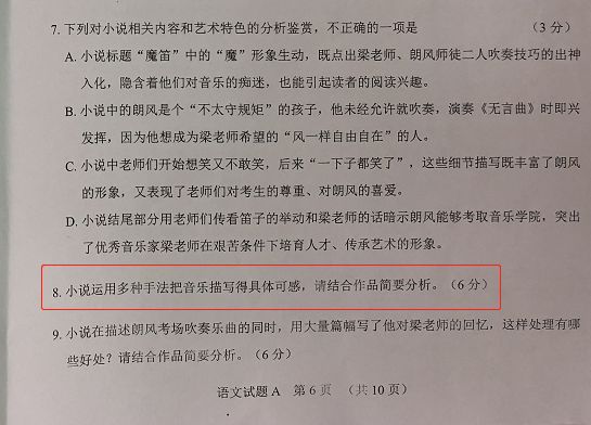 文学类文本,第8题,“多种手法描写音乐”,从小说常用的方式方法出发(逐一筛选),问题清楚明白,基本给定“手法+内容理解+效果”的答题思路。解答此题建议对比所学《琵琶行》中描写音乐的手法,类比分析出答案。
