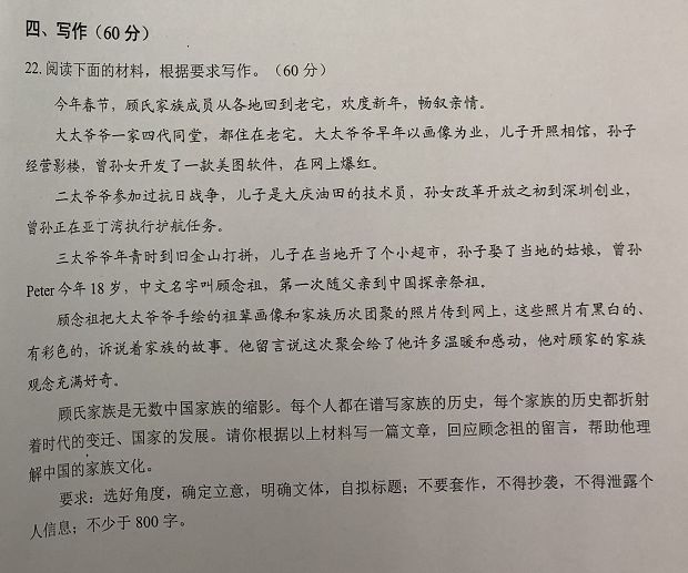 作文每一小段内容都可提取出观点,内容具有碎片化、大容量的特点。内容琐碎,任务指令清晰明确,需要根据写作任务,整合出“个人-家族-时代、国家”内在的文化脐带,主要跟理解家族文化有关。