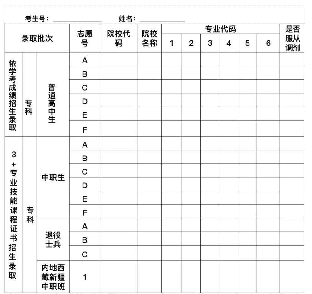 1.填报征集志愿时,高职院校依学考成绩录取和“3+证书”专科中职生考生可填报A、B、C、D、E、F六所院校志愿,每所院校最多可填报6个专业志愿和1个是否服从专业调剂选项;“3+证书”专科退役士兵考生可填报A、B、C三所院校志愿,每所院校最多可填报6个专业志愿和1个是否服从专业调剂选项;“3+证书”专科西藏新疆班考生可填报1所院校志愿,每所院校可填报1个专业志愿。依学考成绩录取的考生按文科类、理科类、体育类、音乐类、美术类专业填报征集志愿。
