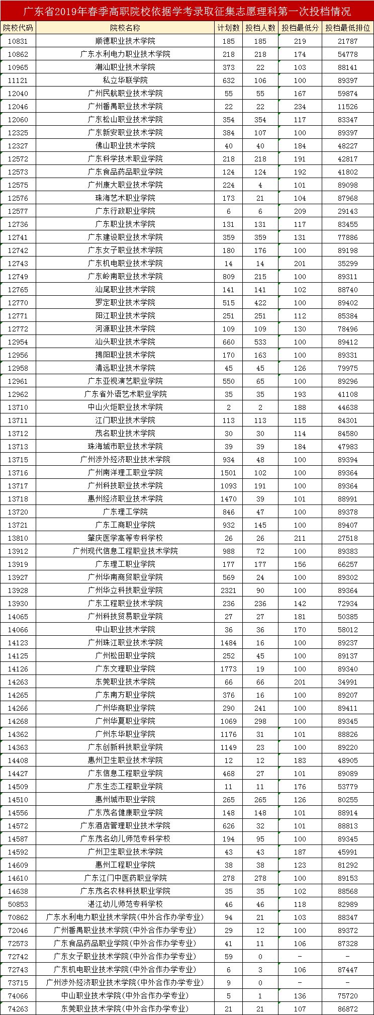 广东省2019年春季高职院校依据学考录取征集志愿理科第一次投档情况
