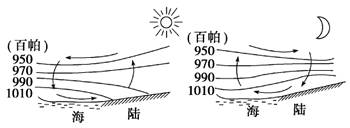 白天在太阳照射下,陆地增温快,气温比海上高,空气膨胀上升,高空气压比原来气压升高,空气由大陆流入海洋;近地面陆地形成低气压,而海洋上因气温低,形成高气压,使下层空气由海洋流入大陆,形成海风。夜间与白天大气的热力作用相反而形成陆风。
