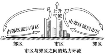 由于城市人们的生产、生活释放出大量人为热,使城市气温升高,空气上升,与郊区下沉气流形成城市热力环流,下沉气流又从近地面把郊区污染物带入城市中心,严重污染了城市环境。因此,为了减轻城市污染,如何减少化石燃料的使用量及如何布局郊区工业及卫星城市,成为人们普遍关心的问题。