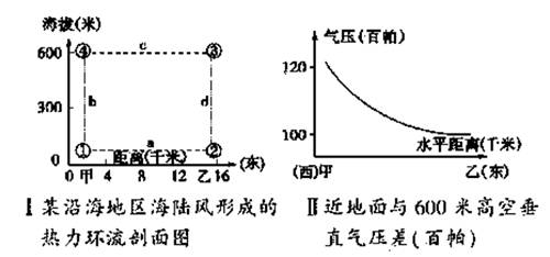 图Ⅰ示意某沿海地区海陆风形成的热力环流剖面图,图Ⅱ为该地区近地面与600米高空垂直气压差的分布状况,读图回答1~2题。
