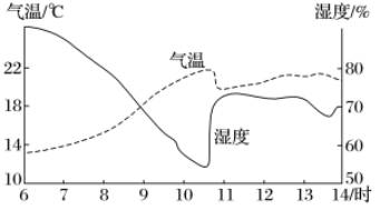 湖陆风包括湖风(出湖风)和陆风(进湖风),是较大湖泊与陆地之间形成的以24小时为周期的地方性风。下图示意位于洞庭湖东北部的岳阳市某日6~14时的气温与湿度变化。读图,完成1~2题。