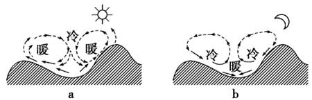 白天因山坡上的空气增温强烈,于是暖空气沿坡上升,形成谷风(如图a)。夜间山坡上的空气迅速冷却,密度增大,因而沿坡下滑,流入谷地,形成山风(如图b)。