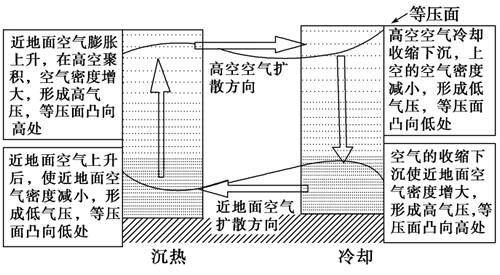 (1)空气升降不同:热上升、冷下沉——近地面热空气上升,近地面冷空气下沉。
