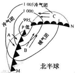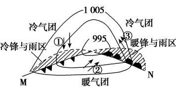 (4)锋面气旋的天气特点:由图可知,气旋的前方由暖锋N控制,故在锋前③处附近出现宽阔的暖锋云系及相伴随的连续性降水天气;气旋的后方由冷锋M控制,故在锋后①处附近出现比较狭窄的冷锋云系和降水天气。