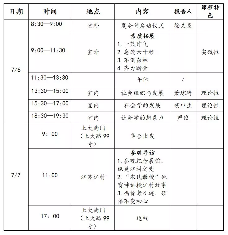 本次夏令营日程主要根据社会学院的各个专业课程情况进行设计,社会学院的专业主要包括社会学、社会工作、行政管理、人类学、民俗学和统计学等。根据专业特色设计,日程的主要内容分为三部分:基础课程、理论导读和实践拓展。首先,基础课程根据每个专业的特色设计,由专业老师开展相应的入门基础课程。其次,理论导读,结合人文社科的特点,设计专业的理论框架课程,让学生了解学科专业的理论知识。再者,实践拓展层面将理论与实践相结合,让高中生学会在实践中融入理论,在实践中探索理论,真正发现问题的本质,解决实际问题。