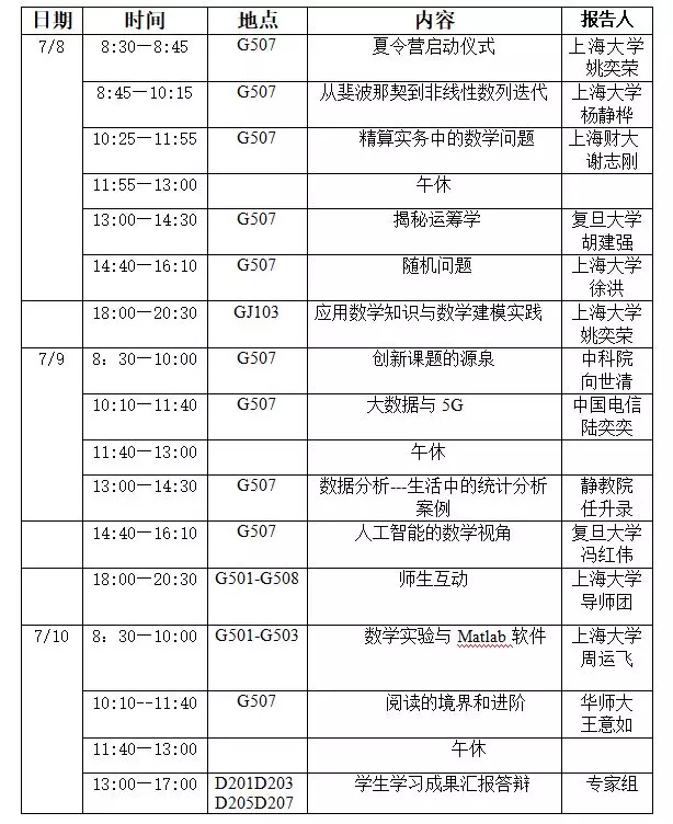 上海大学数学科学实践工作站建立了一支全部具有博士学位且各有特色、各有专长的课程讲师团和项目导师团及大学生和研究生志愿者队伍,还成立了由院士、数学家参与的专家委员会;以确保各项工作有序出色完成。并依托上海大学数学系的教育和科研资源、以数学与应用数学各领域的数学实验和自选研究课题为载体,面向青少年,用通俗浅显的语言,生动活泼的形式,运用信息网络技术,介绍当代数学在生活应用中的七彩话题,激发学生热爱数学的兴趣,培育和增强学生的创新能力和动手实践能力。使学生掌握数学基本概念和基本理论的同时,培养学生数学科学创新和实践的能力。 活动内容: 数学研究的快乐体验夏令营活动设计了拓展型特色课程和创新实践活动,通过报告讲座、讲解演示、动手实践等多种形式增强高中生应用数学解决实际问题的能力,如数据分析能力、数学建模能力、计算机编程能力、探索和发现问题的能力等,充分激发学生迈入科学研究和创新实践殿堂的兴趣。 夏令营日程安排: 地点:上大路99号