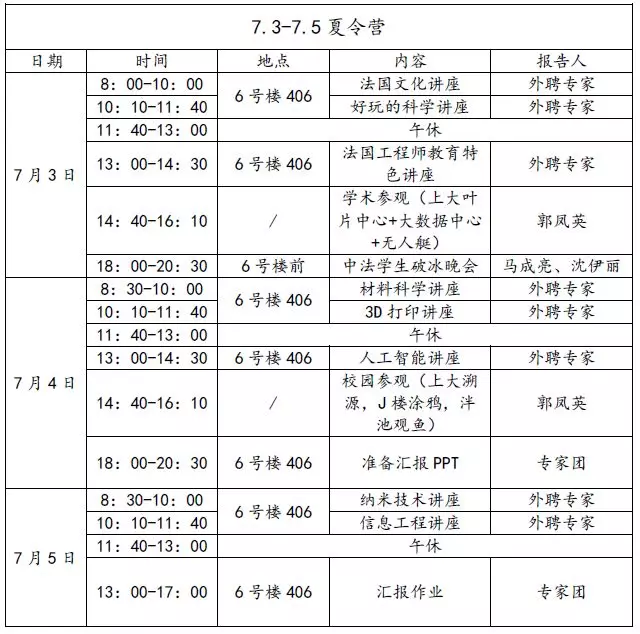 说明:本夏令营方案设计邀请与中欧工程技术学院三个专业(信息工程、机械工程、材料科学与工程)相关领域的专家、教授做学术讲座,能让参与学生更加清晰地了解法国工程教育的发展情况及法国工程师的培养模式;通过法国文化的讲座,让学生更好地了解法国教育与法国文化;通过中法学生联谊活动,让学生了解中法融合课堂;通过学术参观和校园参观,让参与学生更好地了解上海大学。
