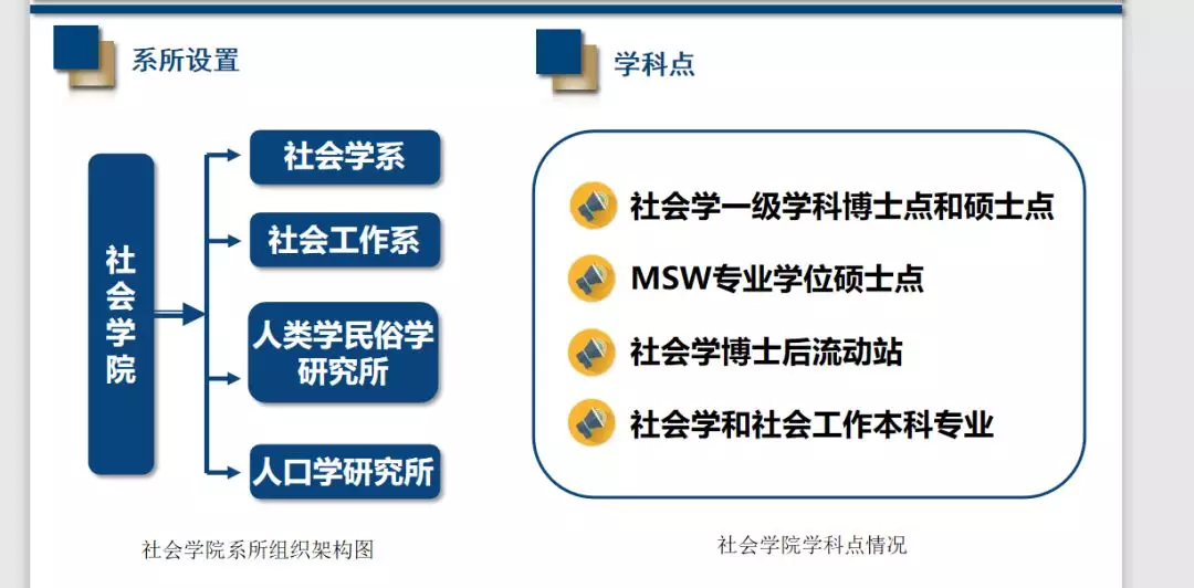 2011年7月,社会学系独立建院,成立社会学院,目前学院下设社会学系、社会工作系、人类学与民俗学研究所、人口学研究所,国家万人计划哲学社会科学领军人才、中宣部文化名家暨四个一批人才、教育部长江学者特聘教授张文宏任院长。