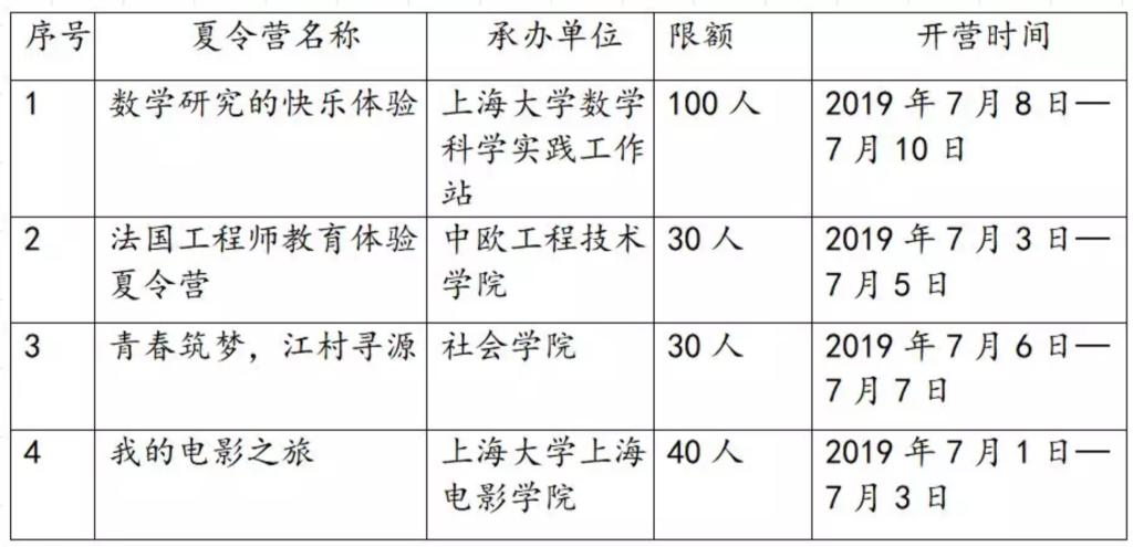 为进一步探索高中与大学合力育人,选拔符合学校人才培养理念的优秀学生,上海大学将结合综合性大学特点于2019年7月份开办四个夏令营。