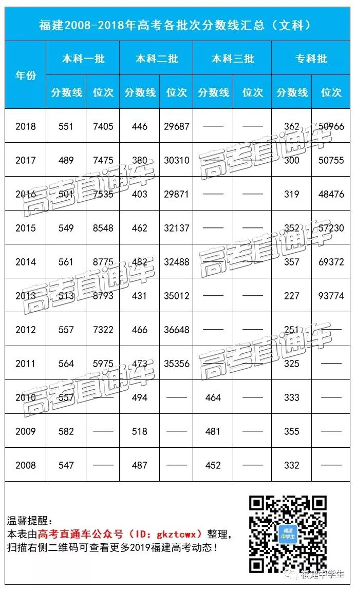 2008-2018年福建高考各批次分数线+位次汇总