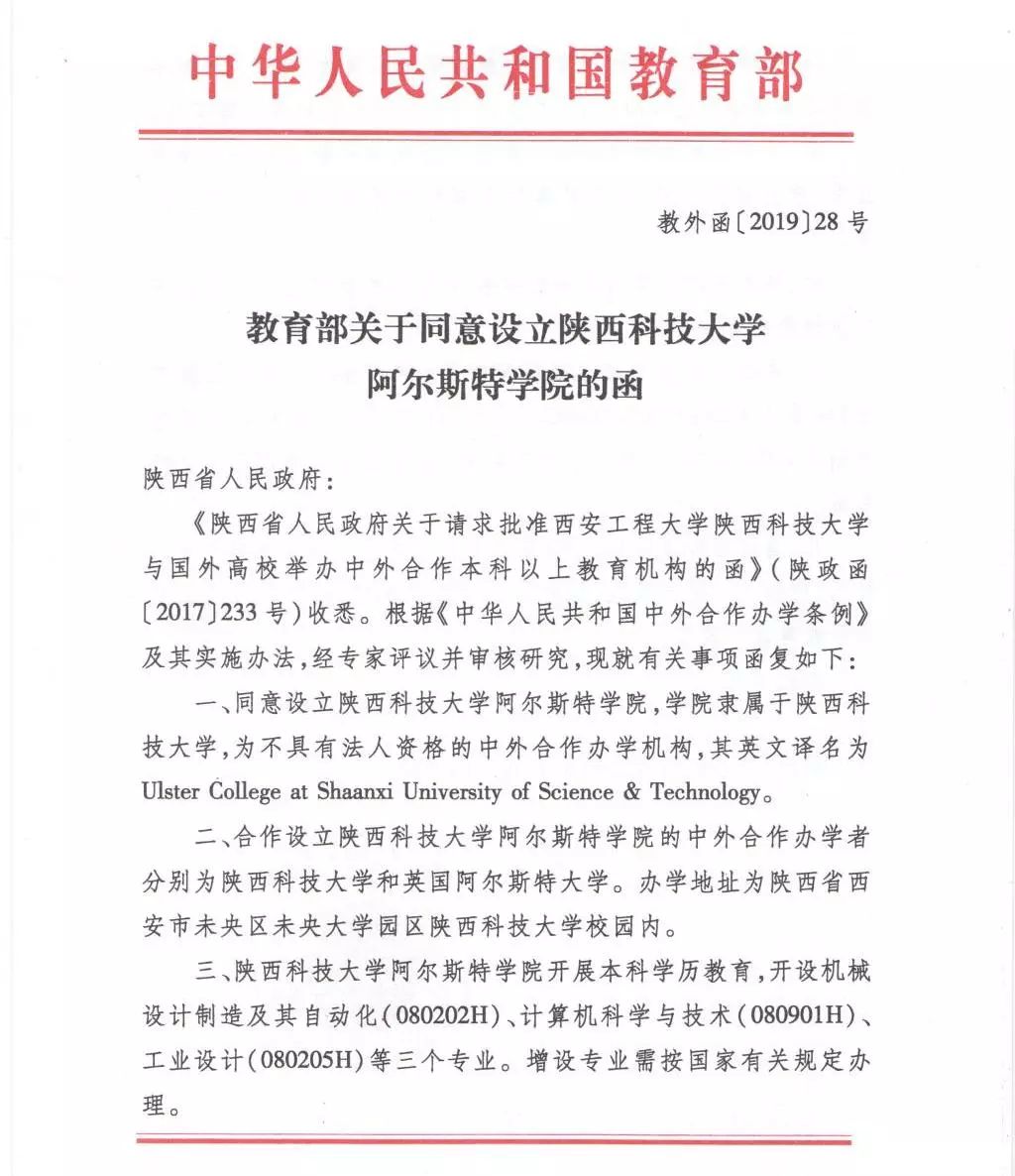陕西科技大学阿尔斯特学院是经教育部批准,由中国陕西科技大学与英国阿尔斯特大学合办的中外合作办学机构(许可证编号为MOE61UKA02DNR20191975N)。2019年起,开始招收机械设计制造及其自动化、计算机科学与技术、工业设计专业,每个专业全国计划招生100人,其中,在陕招生计划共129人。