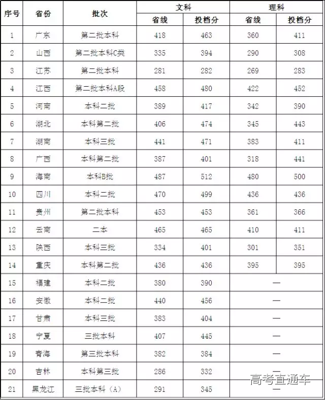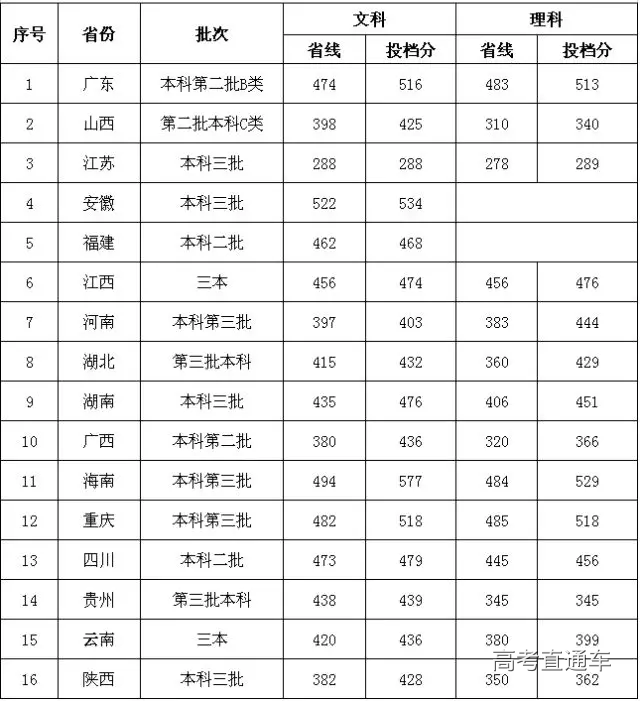 南国商学院近四年在各省(区、市)投档分数线情况统计