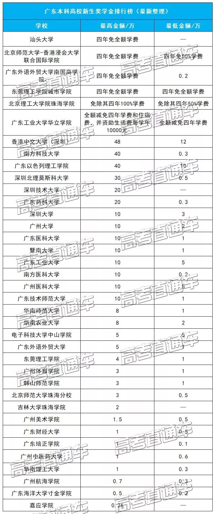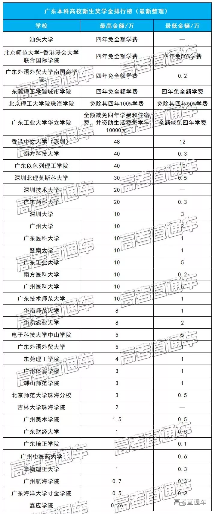 其实在广东,有部分高校为了激励学生努力学习,而实行了四年学费全免的奖励制度,只不过这个奖励机制是针对优秀新生设置的。今天,小编就为大家整理了一份广东本科高校新生奖学金排行榜,看看哪所高校最“壕”!