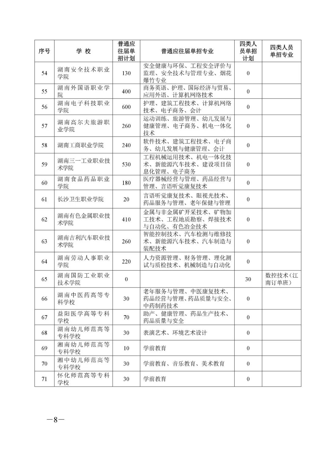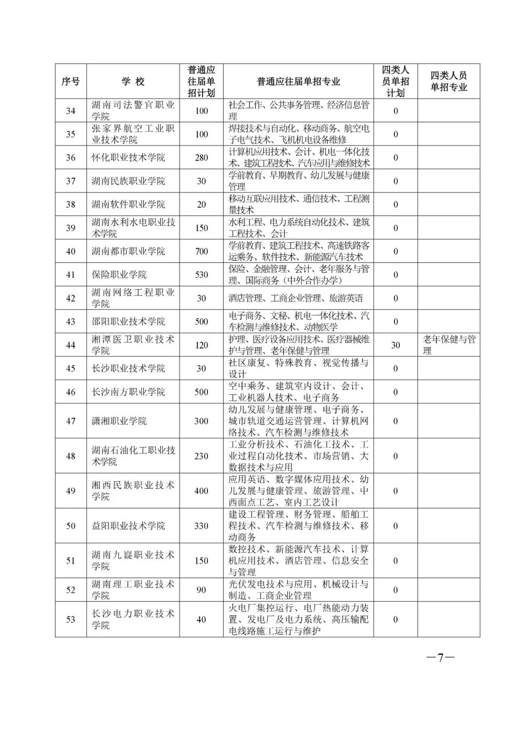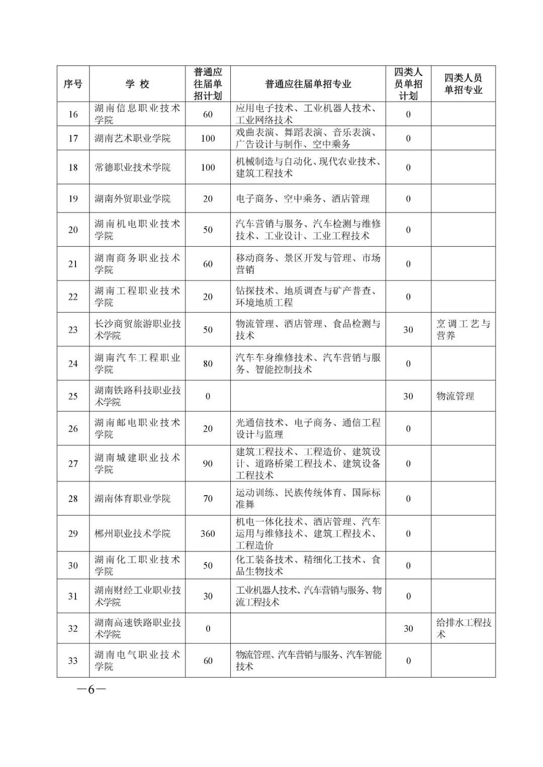 按照学校申报、省教育厅统筹核定的程序,经批准,长沙民政职业技术学院等71所高职(高专)院校开展第二次单招,单招计划总量为10810人。其中,下达67所院校普通应往届高中教育阶段考生招生计划(简称普通应往届计划)10420人;下达13所院校退役军人、农民工、下岗工人和新型职业农民四类人员招生计划(简称四类人员计划)390人。各院校单招计划和专业详见附表。