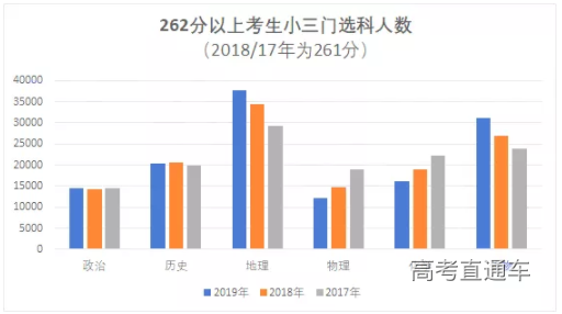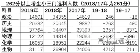 注意:以下是262分以上考生(2018/17年为261分)的选课情况,而非全部考生,全部考生共5万余人,262分以上考生共44048人,比如选考地理的共44561人,但是262分以上的37764人。