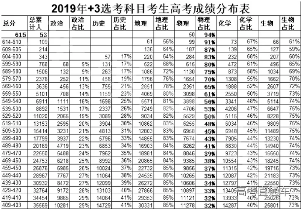 1、全市615分以上共53人,其中选物理考生50人占94%;610分以上总人数109人,物理99人占91%,化学73人占67%,生物66人,地理61人,也就是说绝大部分610以上考生选了物化生地。
