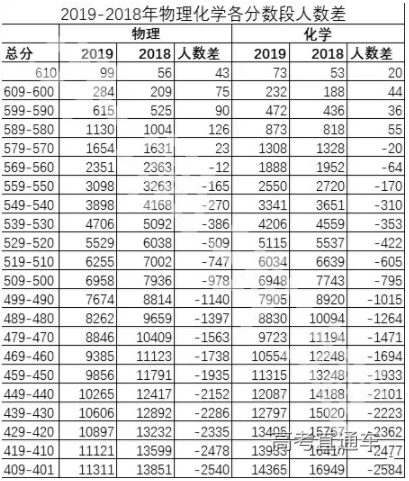 2019年选物理和化学的人数减少,但高分段人数有所增加,570分以下选理化的人数在不断减少,但是2020要求必须选物理的专业组比2019年多了很多,所以估计2020年选物理的人数也会增加很多。