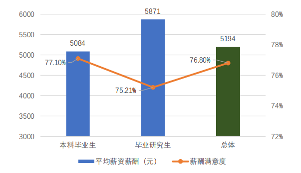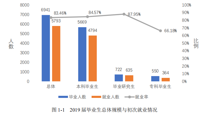 毕业生共计6941人。 其中研究生722人,本科生5669人,专科生550人。 毕业生就业率 初次就业率为83.46%。 就业职业 本科生就业职业 人数最多的行业为“工程技术人员”,占比38.08%。 研究生就业职业 人数最多的行业为“其他专业技术人员”,占比45.50%。 就业区域 就业经济地域分布 人数最多的为“长江中游综合经济区”,占比为41.21%。 就业薪资 总体平均月薪为5194,对当前薪酬总体满意度为76.80%。