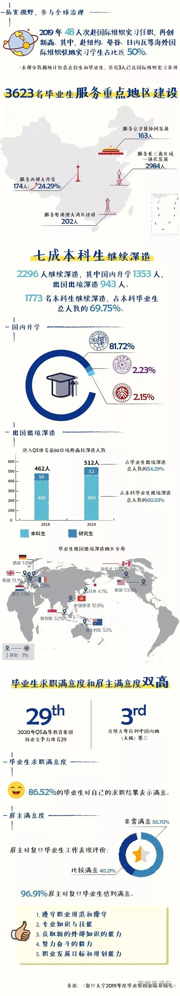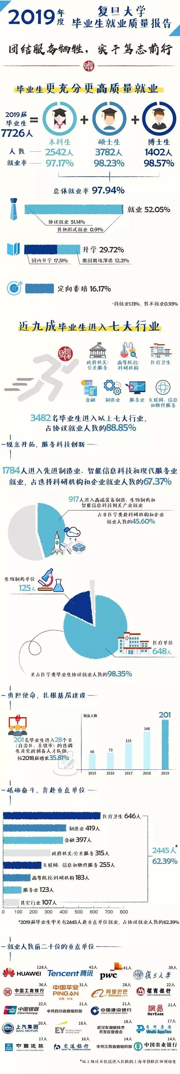 复旦大学发布2019届毕业生就业质量报告:毕业生共7726人,总体就业率97.94%。就业比例为52.05%,国内升学比例为17.51%,出国出境深造比例为12.21%,定向委培比例为16.17%。