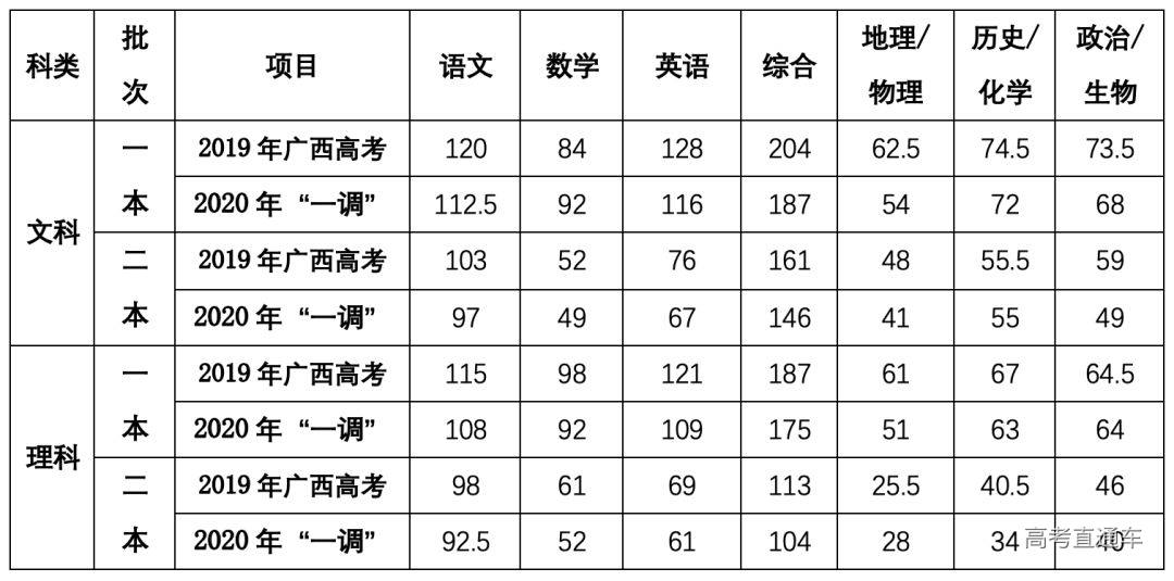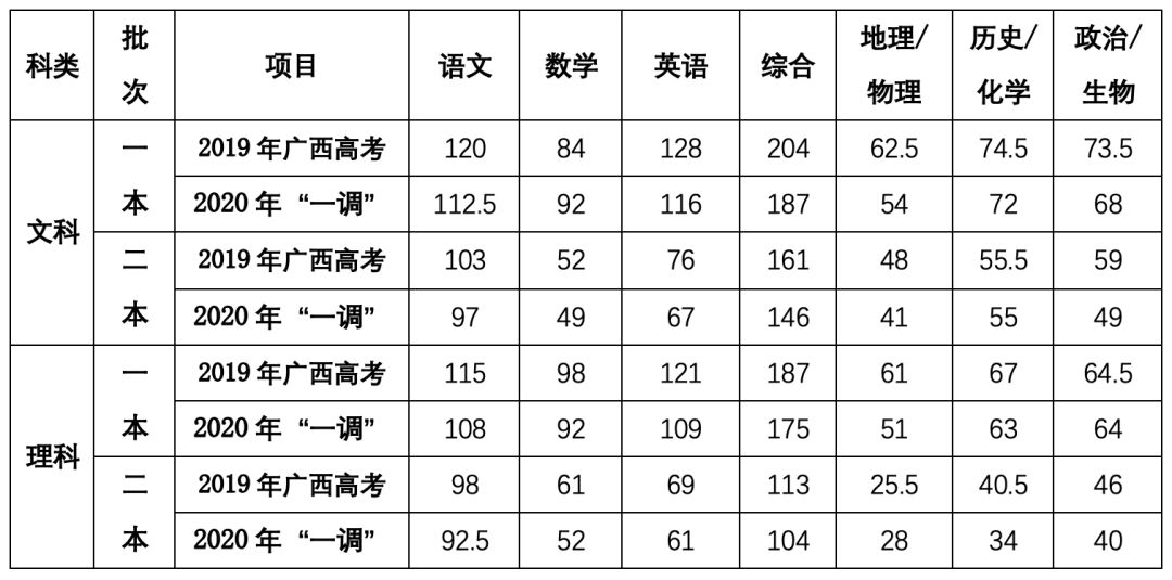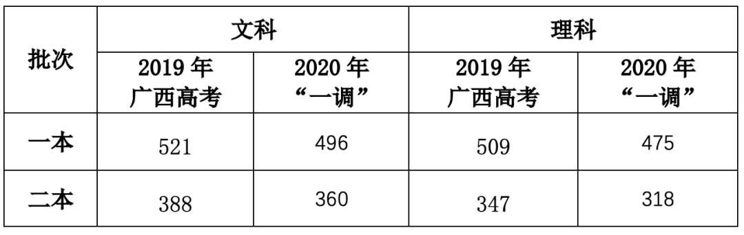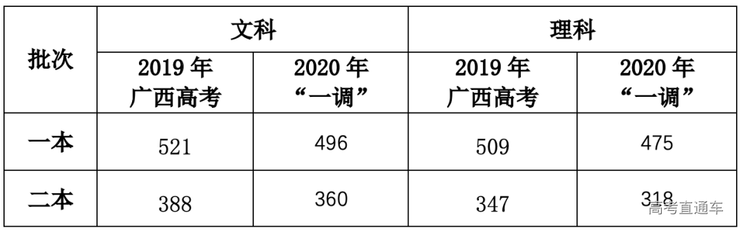 数据分析: 文科试题:总体难度较2019年高考偏难,总分平均分比2019年广西高考文科总分平均分低了1.5分,但与2019年桂林市总分平均分相比则低了23.13分... 文科分数段对应人数: 理科试题:总体难度较2019年高考偏难,总分平均分比2019年广西高考理科总分平均分低6.13分,与2019年桂林市总分平均分相比则低了35.95分... 理科分数段对应人数: 需要注意的是:文科360分以下有4334人,理科318分以下有5724人,分别占到了文科、理科总人数的50.24%和32.31%,说明我市考生两极分化非常严重,低分学生非常多。各校后期复习要切实抓好复习策略,采取措施增强中等生的实力、缩小低分面,提升低分学生成绩,提升二本上线人数。 高中各批次预估上线情况一览 1、示范性高中本科各批次预估上线情况 ↑点击看大图 2、非示范性高中本科各批次预估上线情况 ↑点击看大图